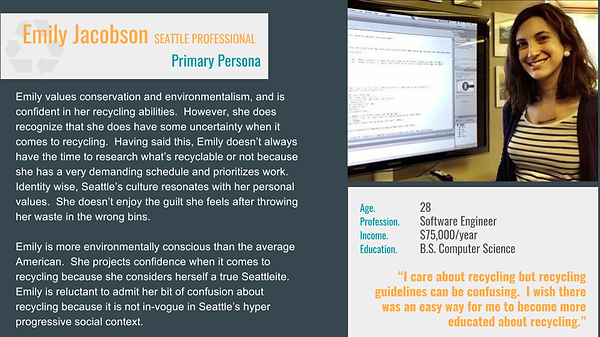 Primary: "I care about recycling but recycling guidelines can be confusing. I wish there was an easy way for me to become more educated about recycling"